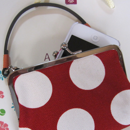 iPod Touchとイヤフォン(内ポケットに)を入れて、お店のポイントカードを数枚収めて、鞄の中に放り込んでいる。鞄の中はがま口だらけになりつつある・・・(^^;)